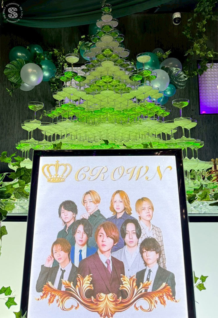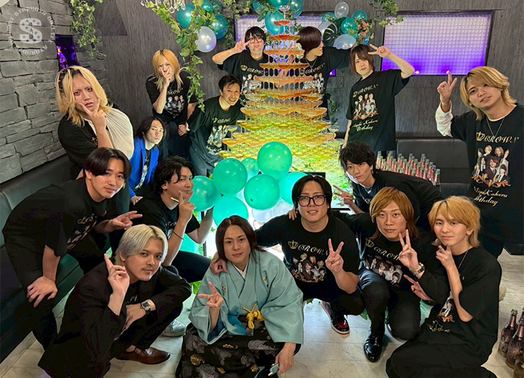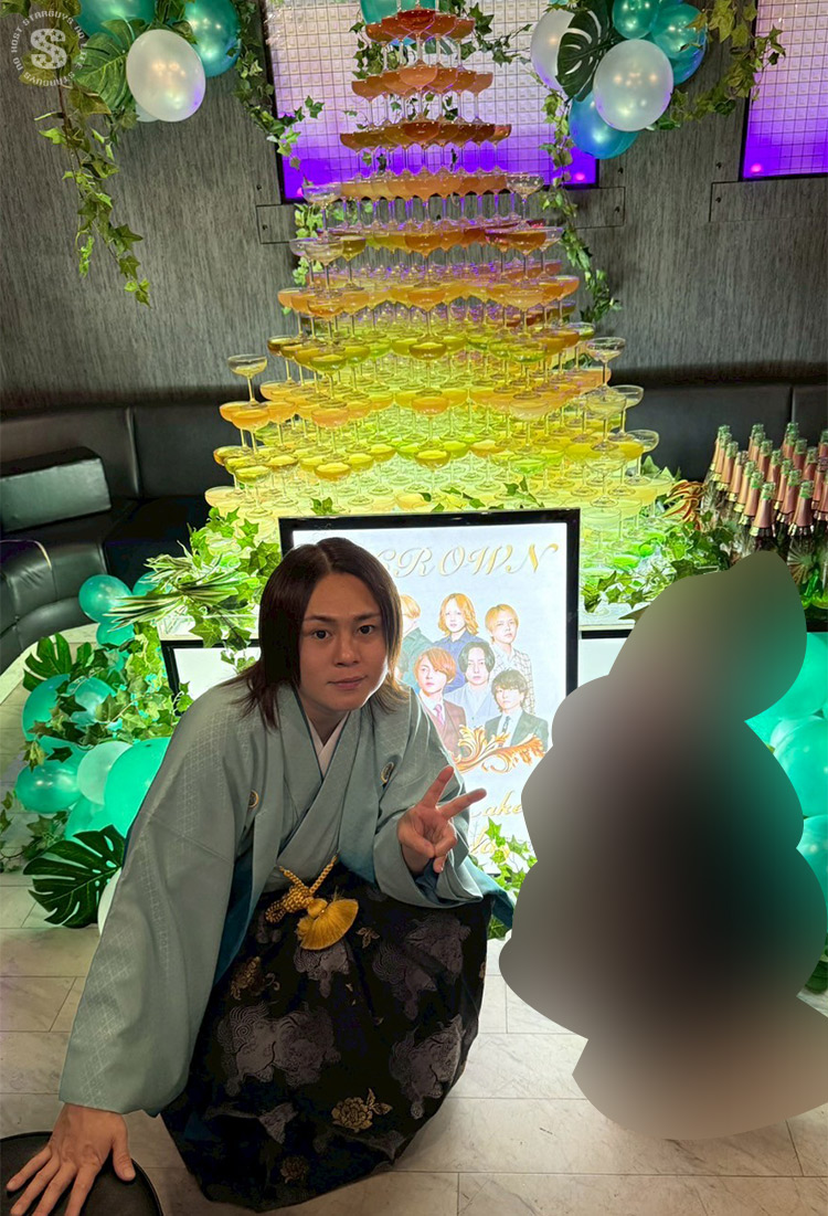 華やかな着物姿と、大きなシャンパンタワーが印象的な
