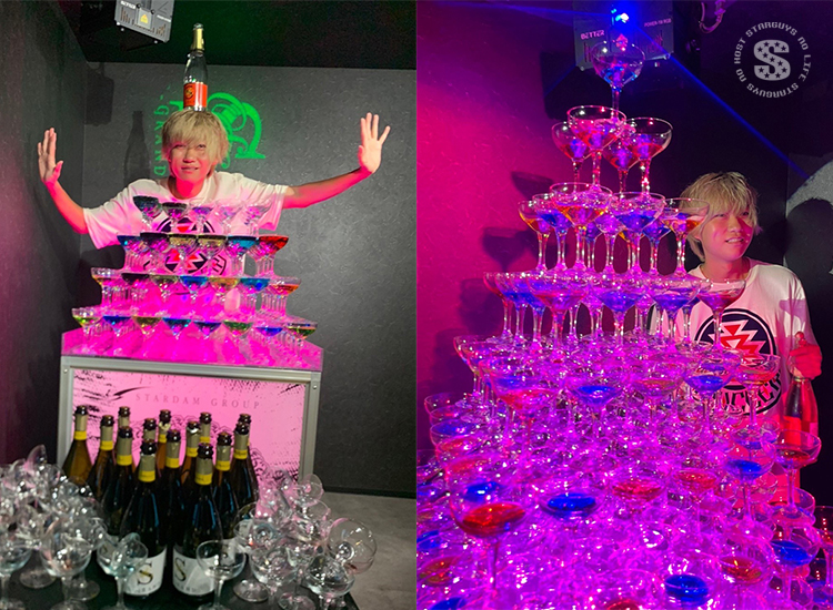 紫にライトアップされたシャンパンタワーが聳え立ちます・:*+.(( °ω° ))/.:+