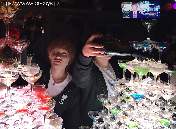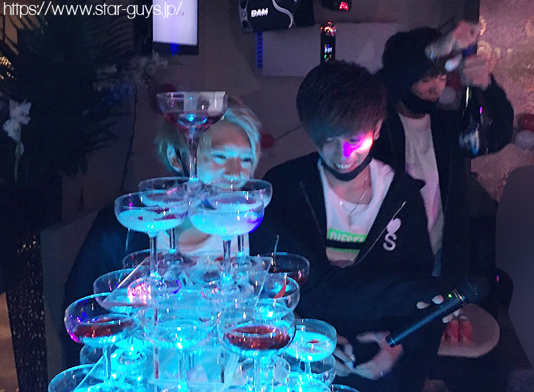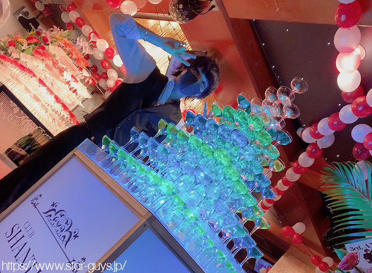 青と緑の涼しいシャンパンタワーと並んでイケメンホストの記念ショットも Σ【◎】∀・)パシャッ