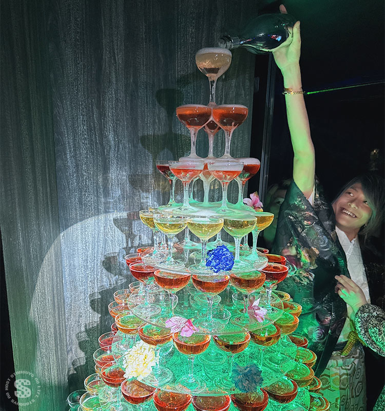 愛くんが背伸びしないと届かないほどに大きなシャンパンタワーも見どころですね。