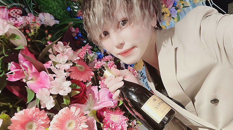 ズラリと並んだたくさんの特大祝い花と一緒に