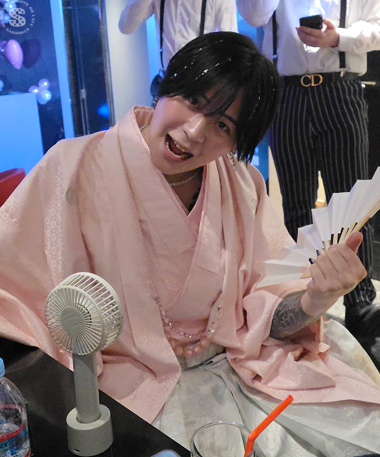 店内も華やかなピンクに飾り、自分も艶やかな和装に身を包んだめいくん。