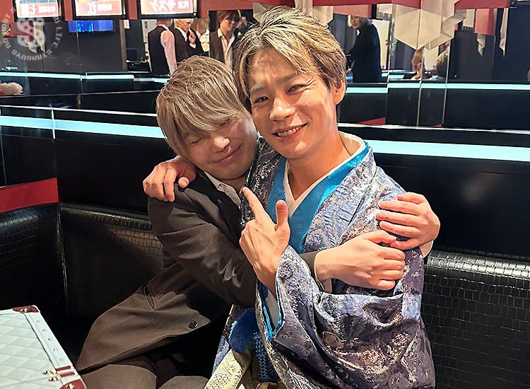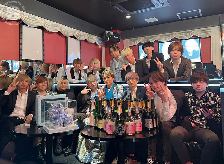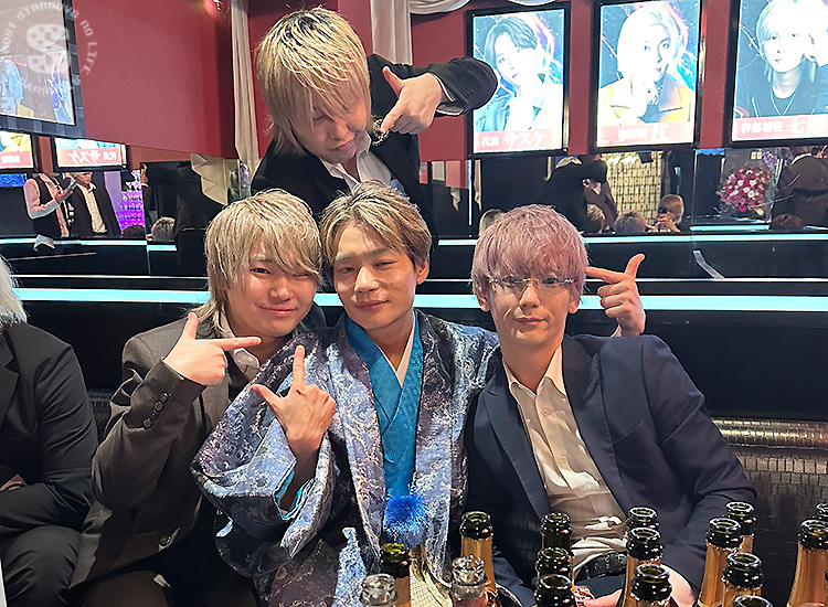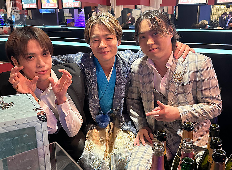 たくさんのシャンパンや高級ボトルに囲まれ