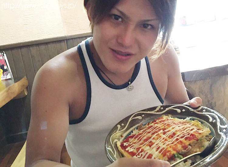 海のシーンと打って変わってまたまた食事のシーンです☆美味しそうなお肉にテンションアゲアゲの迅代表をパチリ♪