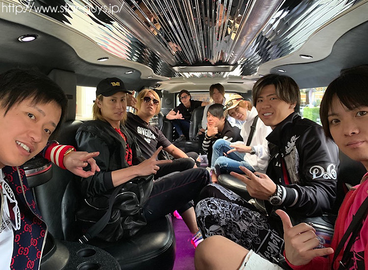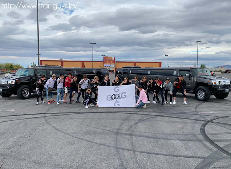 GOのロゴと一緒に皆で記念写真!そして背後にはミナミでも見たことがないような巨大なリムジンが2台も!