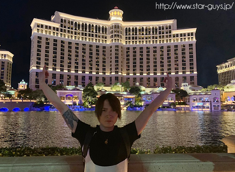 ベラージオ・ホテル・アンド・カジノの前でポーズをとるまさきんぐ代表取締役。世界に名だたる名所をバックに写真を取れるのもGOグループの魅力です。