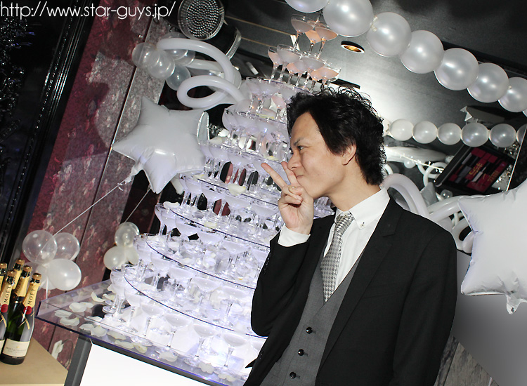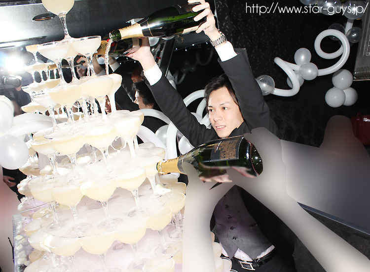 シャンパンを2本同時に勢いよく流し込む王子の玄支配人~! 遂にタワーが完成です♪