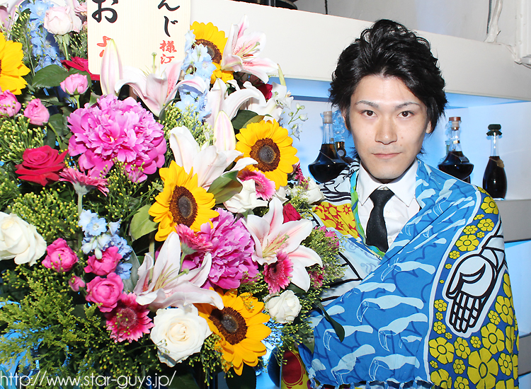 れんじ君です!お祝いの綺麗なお花の前で、一枚撮らせて頂きました♪