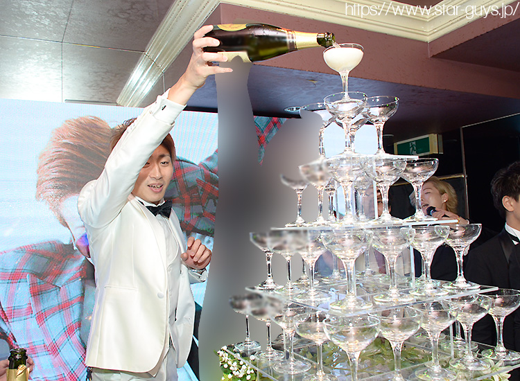 待ちに待ったメインインベントのシャンパンタワーが始まります! まずはヨシキくんが豪快にシャンパンを開栓(^O^)/