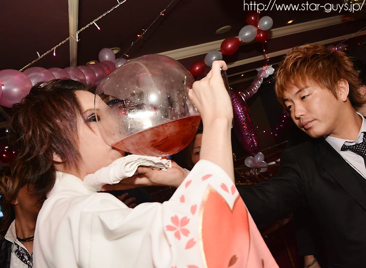 シャンパンコールがスタートです!!特大グラスに注がれた紅いシャンパンを、宙生幹部補佐がイッキ!!