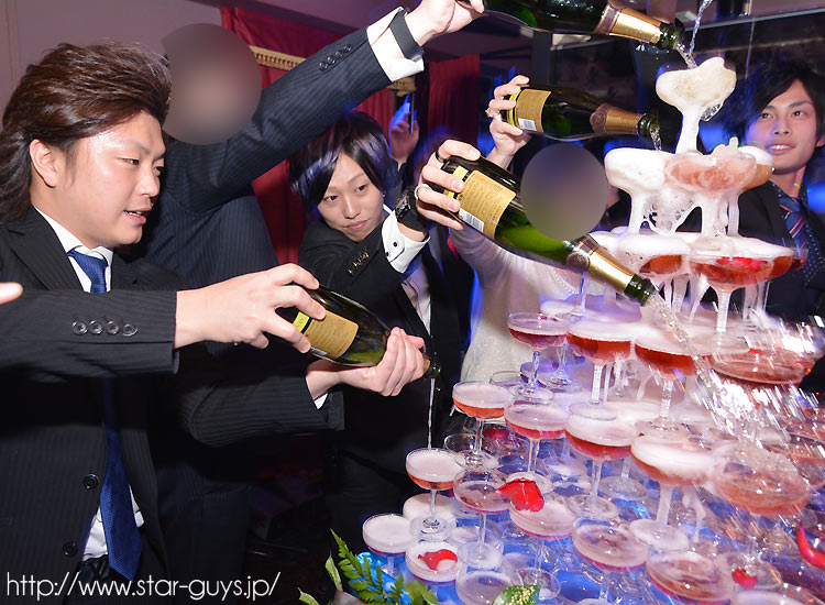 最後はみんなで一斉に注ぎます!!見事シャンパンタワーが完成しましたよ!!