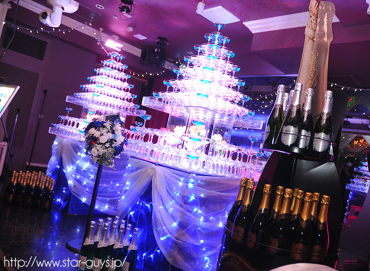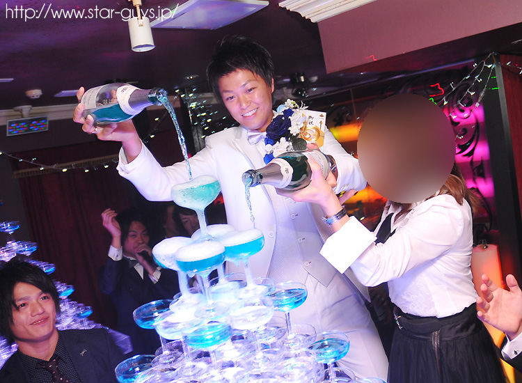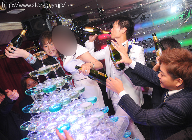 大量のシャンパンを佑介くんと姫様とで仲良く流し入れると同時に、スタッフもボトルを傾けてタワー完成をアシスト♪