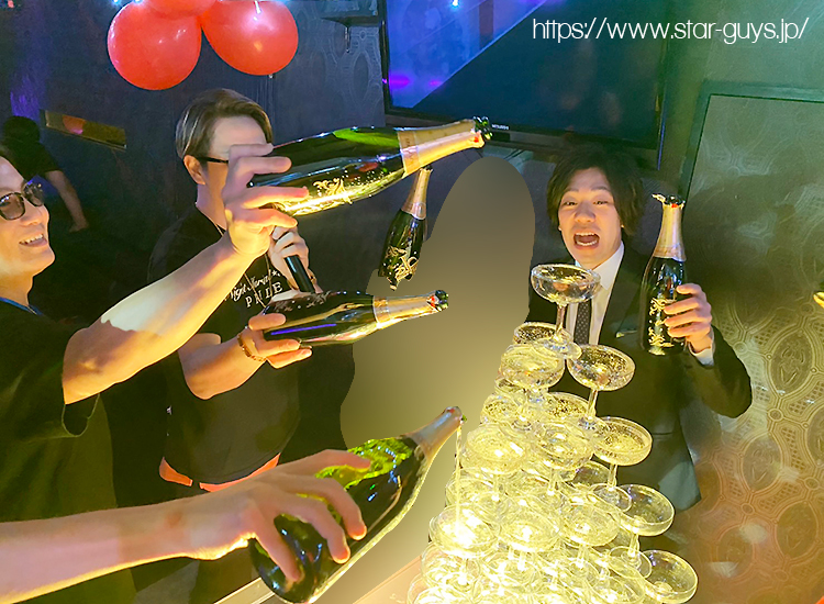 早くもシャンパンタワーがスタート!! 姫と王子である諒副主任がタワーへ注いでいきます!!