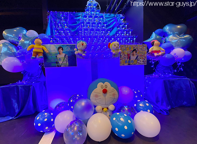メインイベントのシャンパンタワーは真っ青に染まり、ドラえもんでかわいく飾られています♪